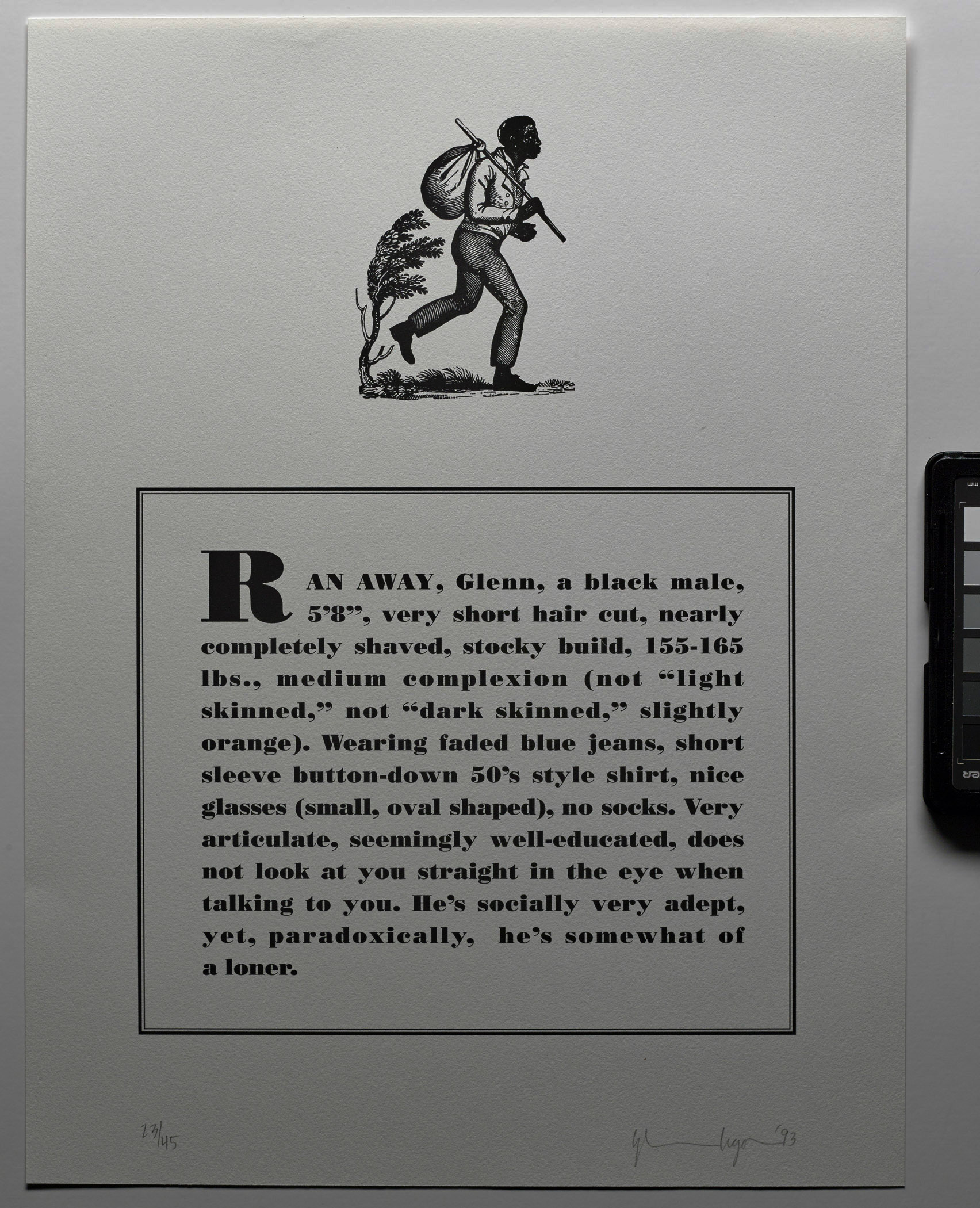 2015-13-10_at_rkg Previous Published February 3, 2017 at 1704 × 2100 in Glenn Ligon: Runaways (1993) Lithographs, 10 prints Runaways (10 of 10) After Treatment – Raking Light