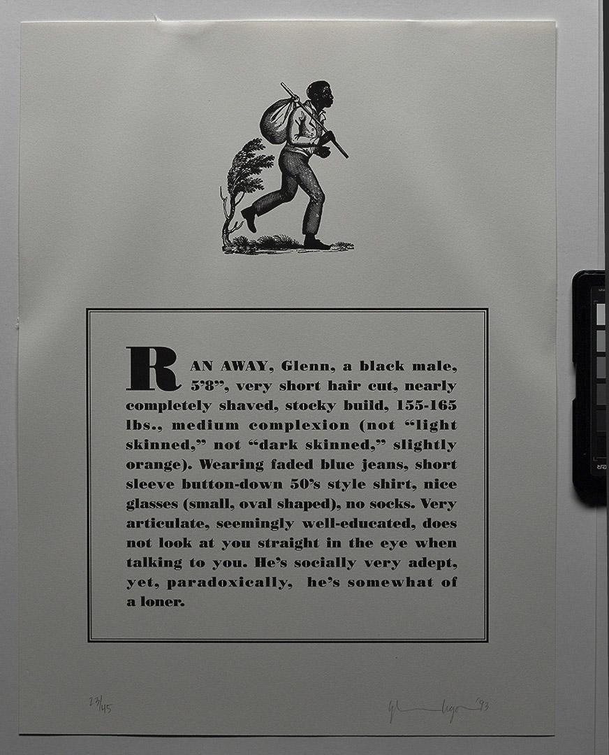 2015-13-10_bt_rkg_s Previous Next Published February 3, 2017 at 872 × 1080 in Glenn Ligon: Runaways (1993) Lithographs, 10 prints Runaways (10 of 10) Before Treatment – Raking Light