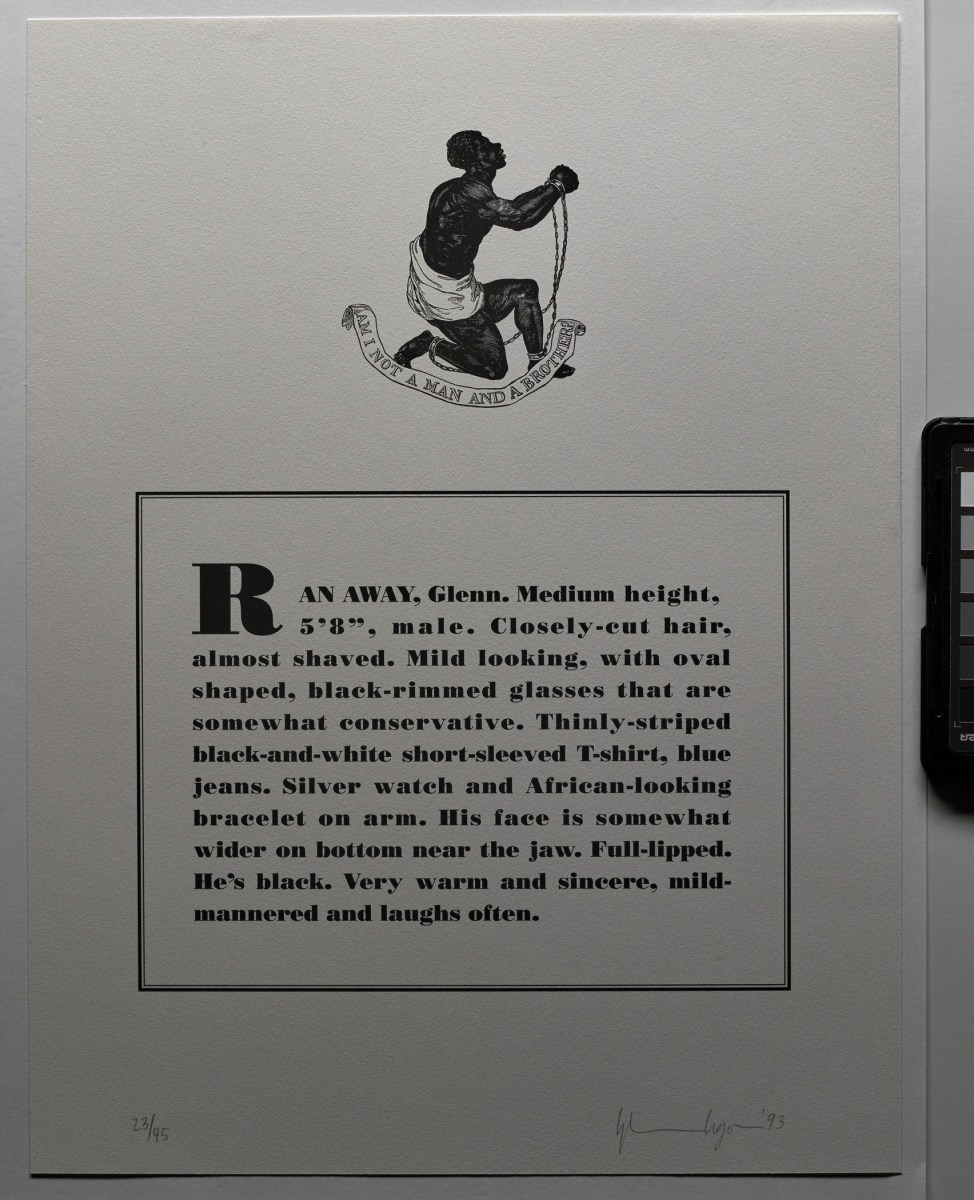 2015-13-1_at_rkg Previous Next Published February 3, 2017 at 1704 × 2100 in Glenn Ligon: Runaways (1993) Lithographs, 10 prints Runaways (1 of 10) After Treatment – Raking Light