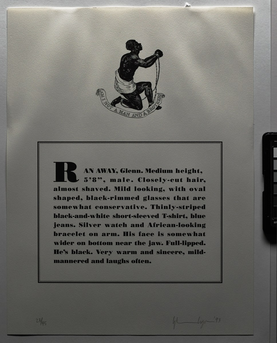 2015-13-1_bt_rkg_retouch Next Published February 3, 2017 at 3945 × 4890 in Glenn Ligon: Runaways (1993) Lithographs, 10 prints Runaways (1 of 10) Before Treatment – Raking Light