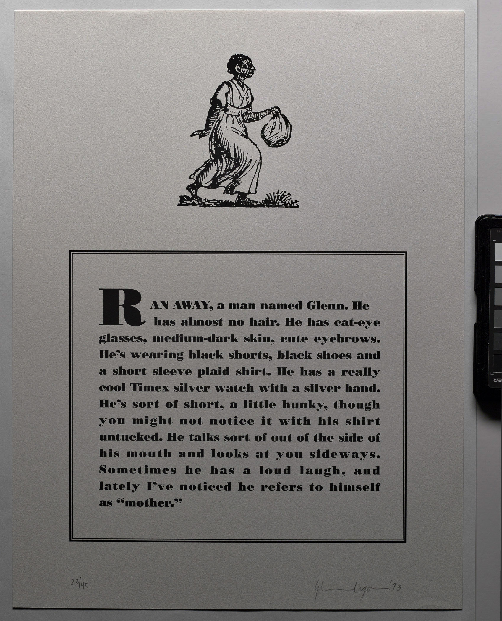 2015-13-2_at_rkg Previous Next Published February 3, 2017 at 1698 × 2100 in Glenn Ligon: Runaways (1993) Lithographs, 10 prints Runaways (2 of 10) After Treatment – Raking Light
