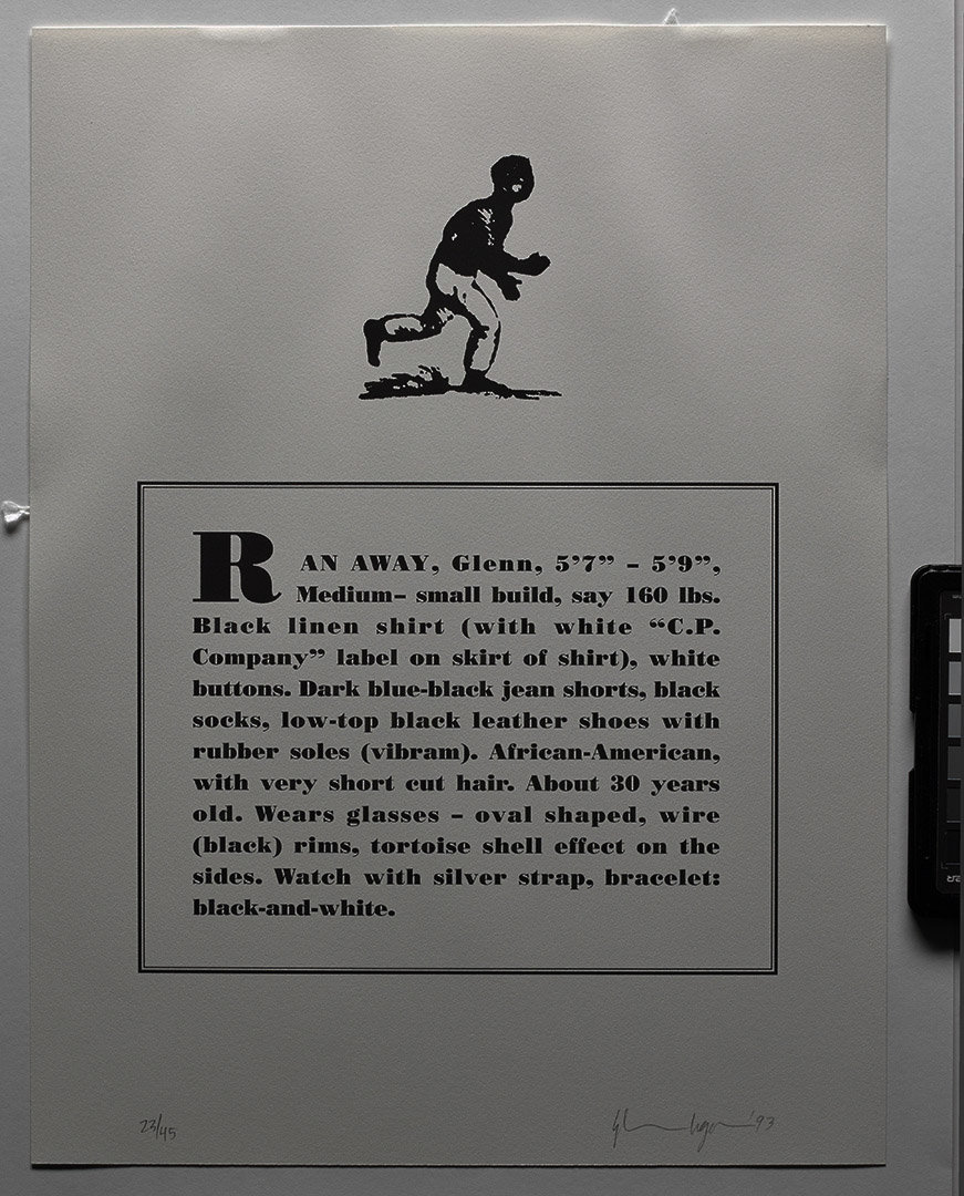 2015-13-9_bt_rkg_s Previous Next Published February 3, 2017 at 871 × 1080 in Glenn Ligon: Runaways (1993) Lithographs, 10 prints Runaways (9 of 10) Before Treatment – Raking Light