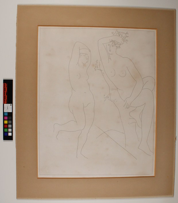 This etching on wove paper by Pablo Picasso, Deux Femmes nues dans un Arbre, 1931 arrived adhered to an acidic window mat. There was overall discoloration and foxing spots marking the surface of the print. The window mat was removed, and the stains addressed via washing, alkalisation, and bleaching treatments.